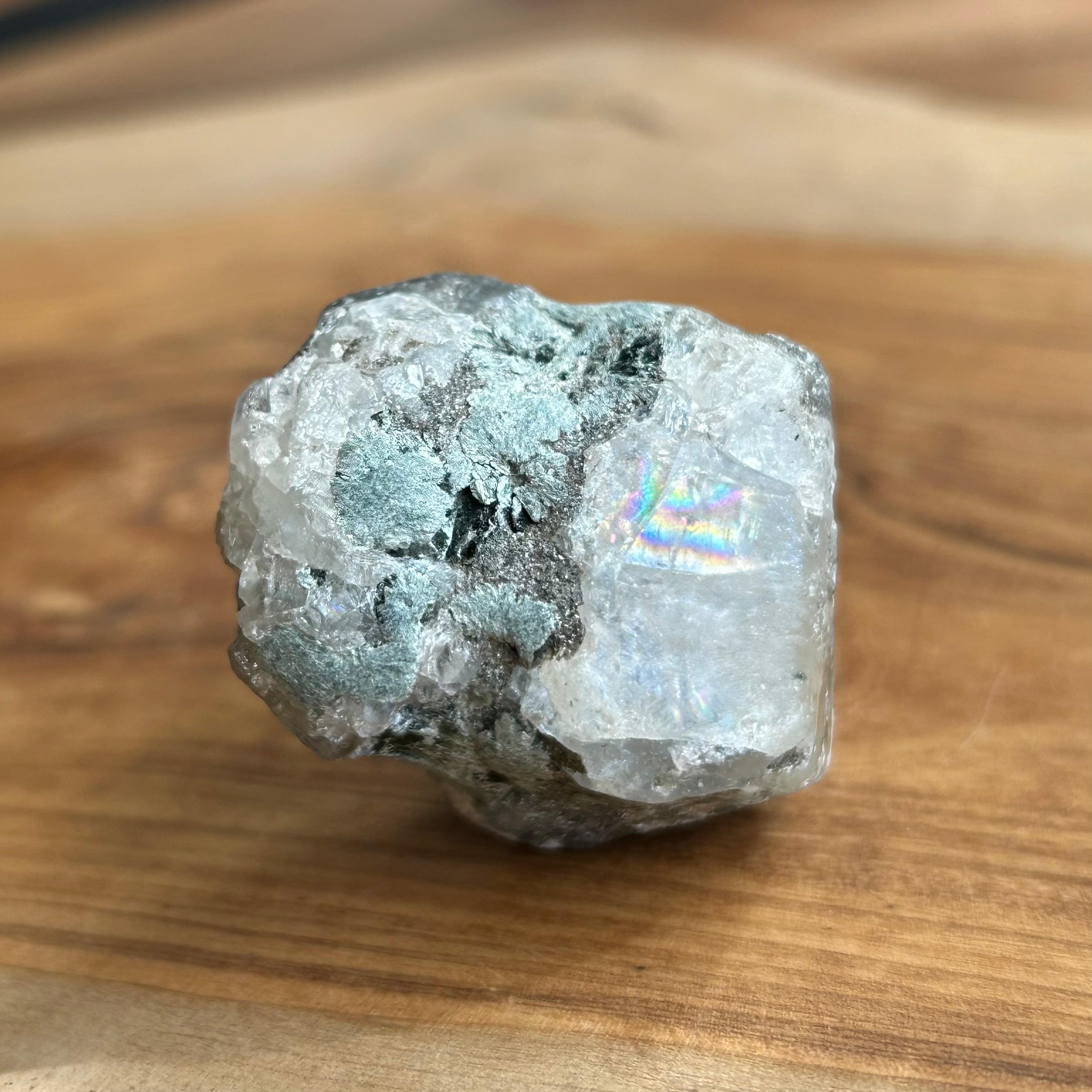 特筆すべきは、大きな宝石質の結晶がドーンと入っている事! ここには虹も見えます。仕入れ元では品質表示としてこのフェナカイトさんに最も高い品質ランクを付けていました。