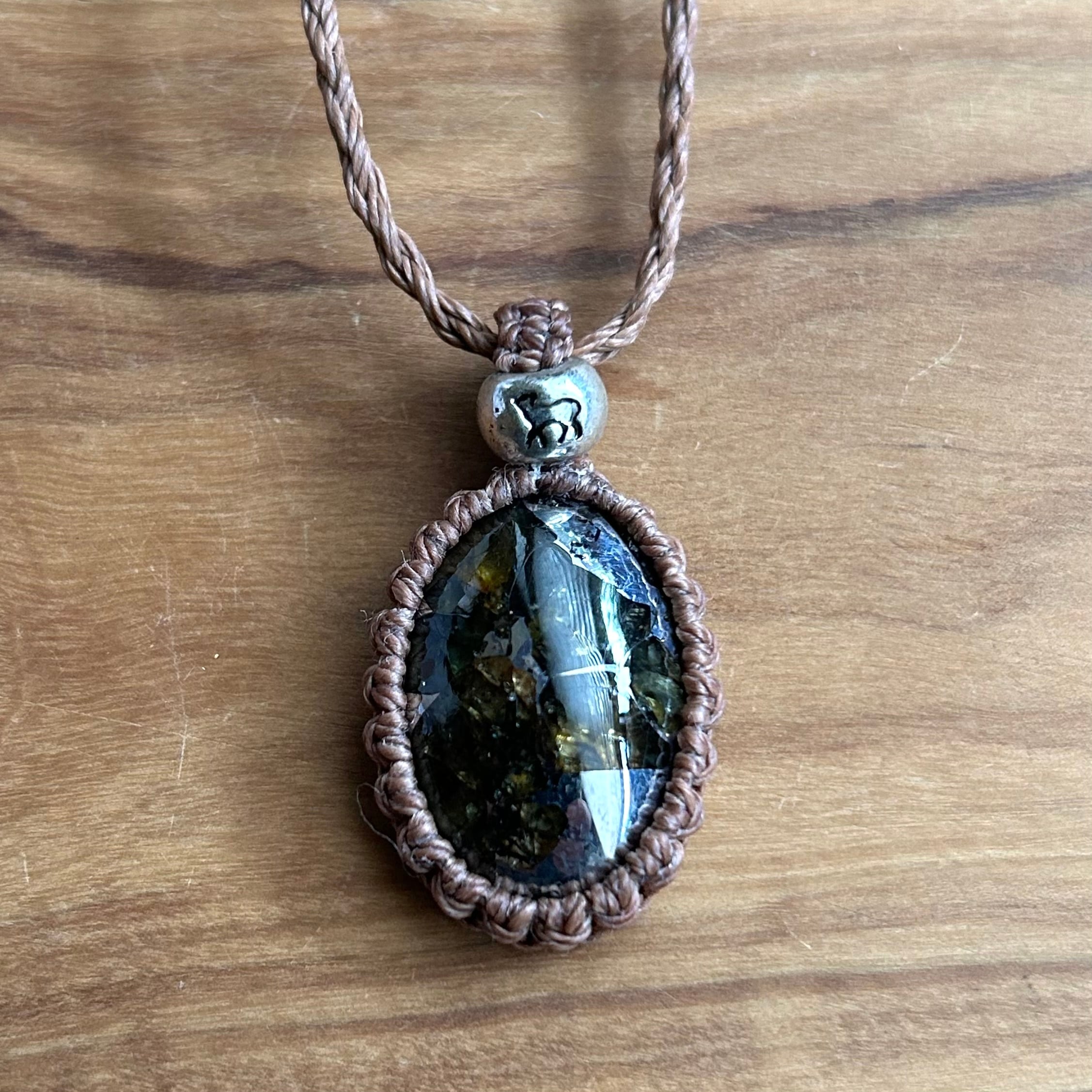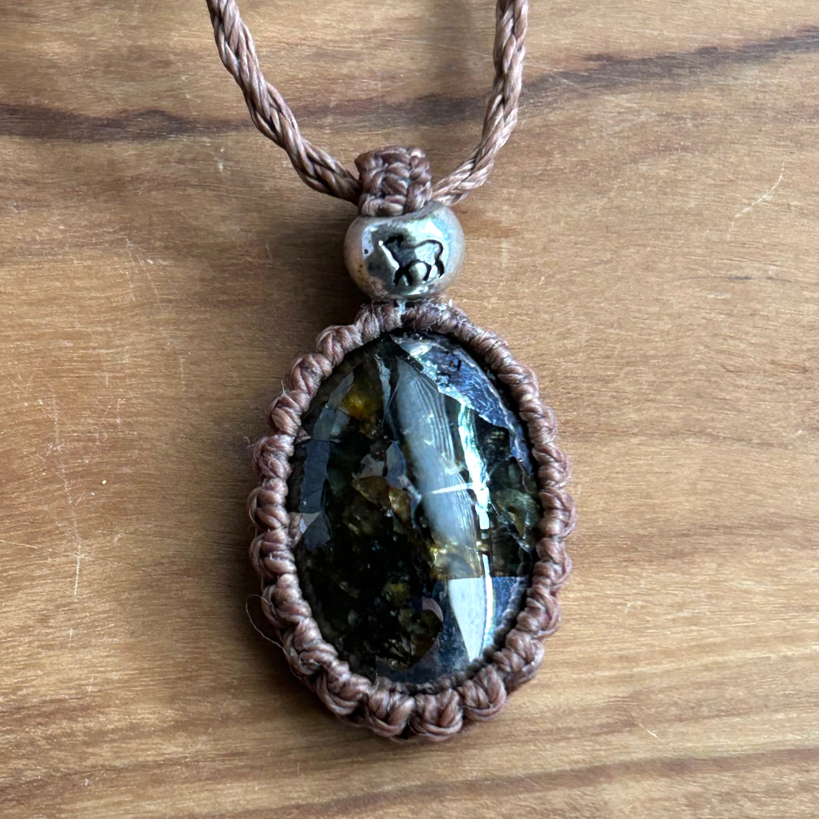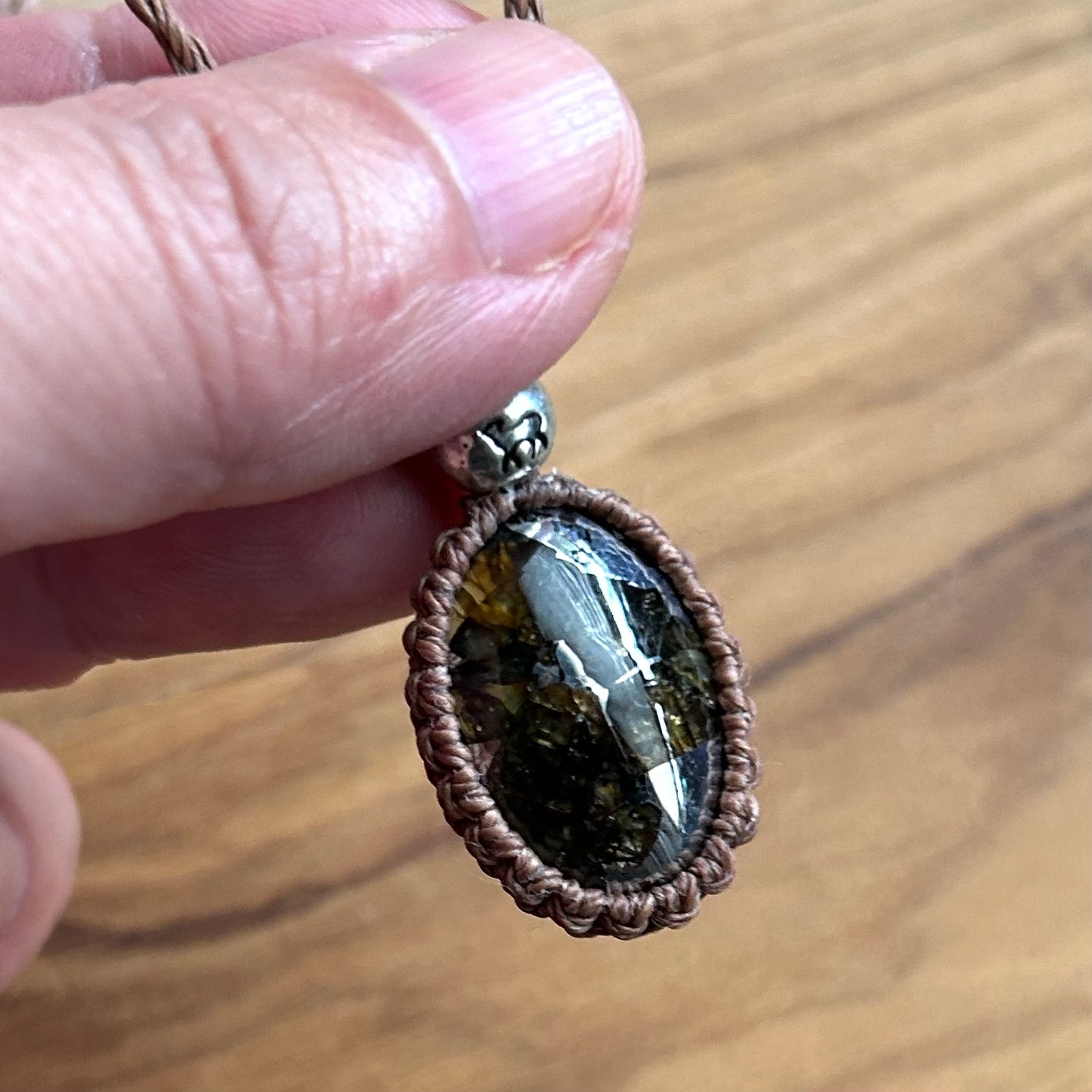 わたしもパラサイト隕石のマクラメネックレスを持っています。身につけていて気がついたのは、パラサイト隕石は金属的でクッキリ冴え冴えとした模様なので周囲に沈んだり同化することなく、どんな色や柄物の服に合わせても存在感が際立つということ。どこにもない個性的なネックレスとして大活躍してくれています。身につけているとよく知らない人から「そのネックレスは何ですか?」と声をかけられます。目を釘付けにする存在感があるのだと思います。この、極力他人に干渉しない東京砂漠でいきなり知らない人に質問するのはこの方もさぞかし勇気が必要だっただろうと思い、満面の笑みで「隕石ですー^ ^」と言いながら立ち去ります。あまりに予想外な答えすぎたら相手の方もリアクションに困るでしょうから笑笑。