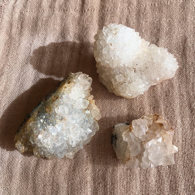 この石の本当の名前は天然レインボークォーツといって、なんと!ホワイトオーラのように人工的に金属を吹き付けてつくったオーラではなく、天然のオーラなのです。画像で表現するのがむずかしいくらいの精妙な輝きなのでほとんど撮れていないのですが、角度を変えるたびにチクチクのあらゆる面で、ブルー、グリーン、ピンクなどの輝きが現れます。
