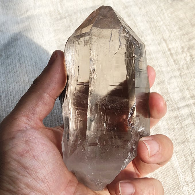 ライトスモーキーで、画像よりも実物の方がもっと色が薄く、水晶としても十分楽しめる透明度です。